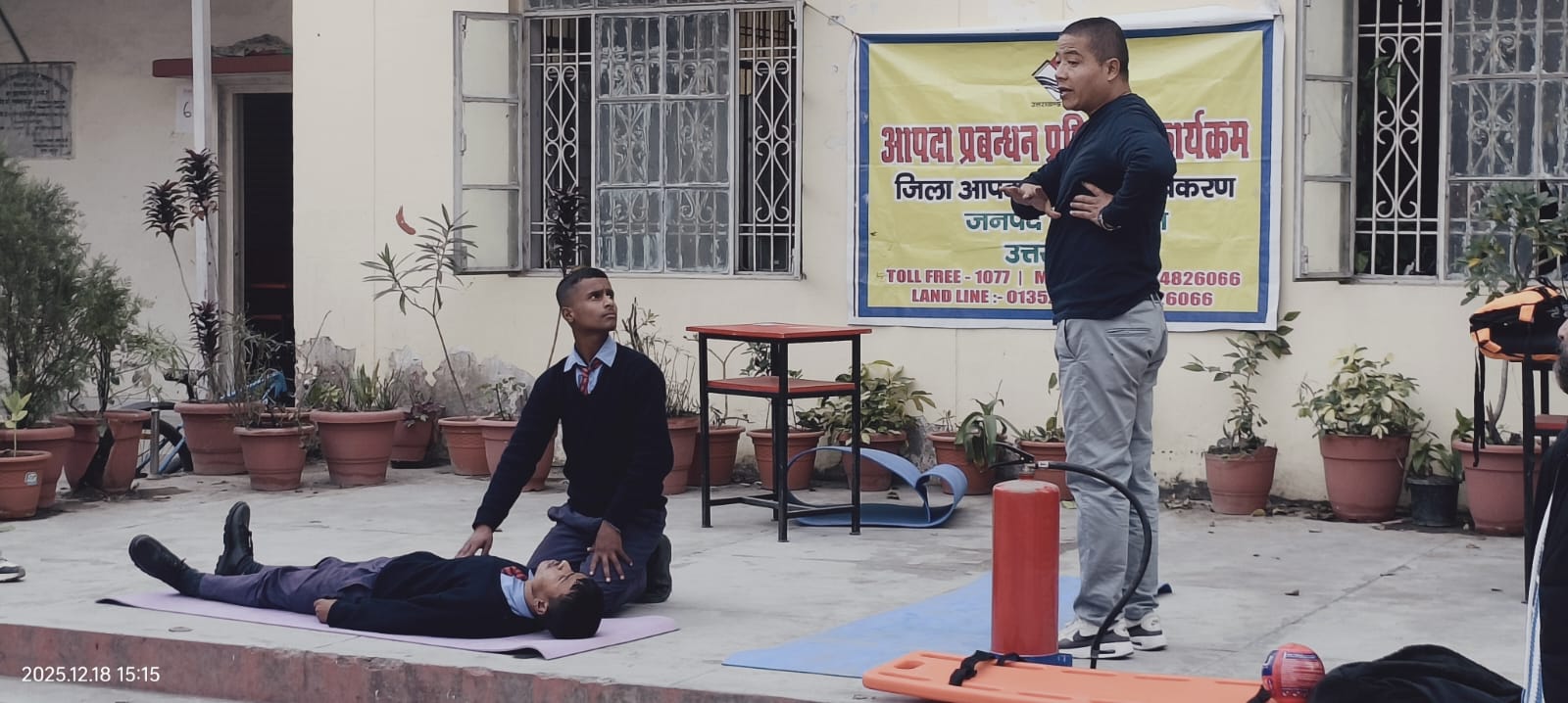 कार्यक्रम के दौरान जिला आपदा प्रबंधन प्राधिकरण के मास्टर ट्रेनर श्री राजू शाही ने भूकंप, बाढ़, भूस्खलन, युद्ध, आतंकवाद सहित अन्य आपदाओं के समय अपनाए जाने वाले सुरक्षा उपायों की विस्तृत जानकारी दी। उन्होंने प्राथमिक उपचार, आपातकालीन दूरभाष नंबरों, भूदेव ऐप, सचेत ऐप, सैटेलाइट फोन के उपयोग तथा आपदा प्रबंधन में प्रयुक्त विभिन्न उपकरणों की कार्यप्रणाली को सैद्धांतिक एवं व्यावहारिक रूप से समझाया।